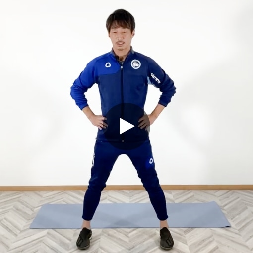 - 足を肩幅より少し大きく広げ、足のつま先とひざがまっすぐ前を向くように立ちます。両手は腰につける、または前に伸ばします。