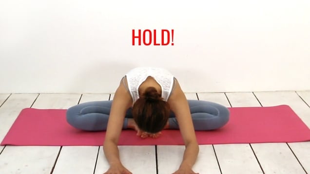 息を吐きながら、体を大きく前に倒していきます。倒しきったら、手を前方のらくにつける位置へ。そのままの姿勢で5呼吸の間ホールドします。