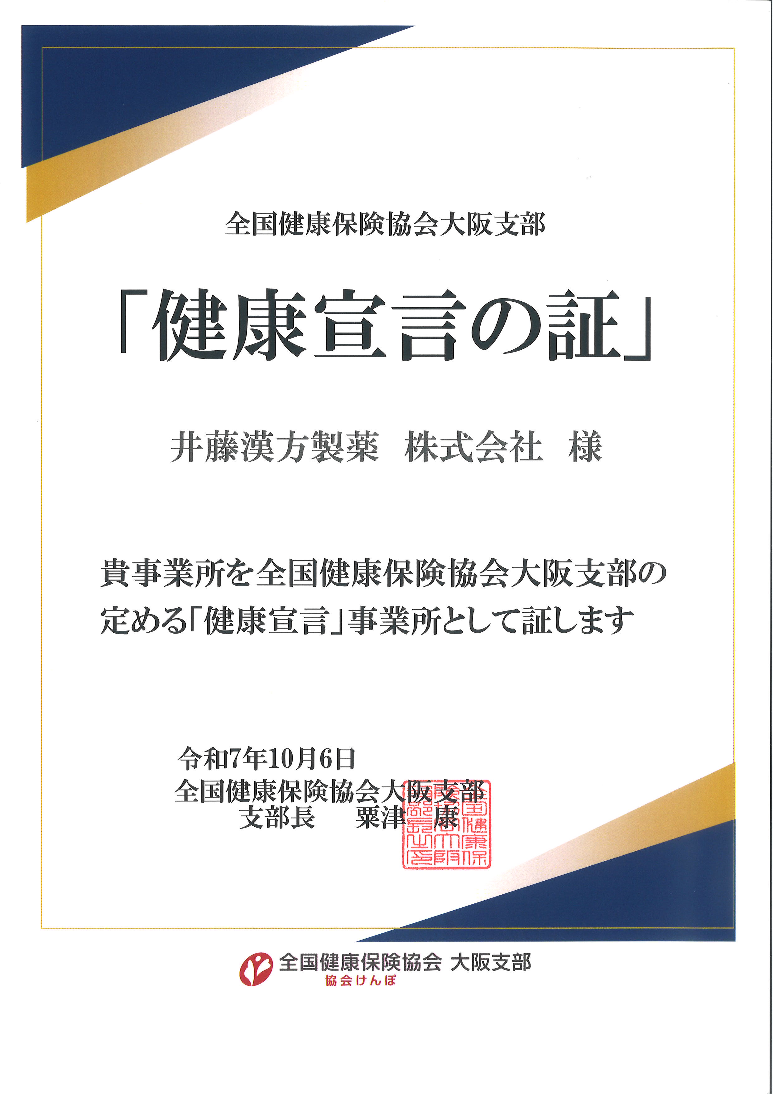 井藤漢方製薬株式会社は、このたび、全国健康保険協会(協会けんぽ)大阪支部へ「健康宣言」を行い、「健康宣言の証」を取得いたしました。