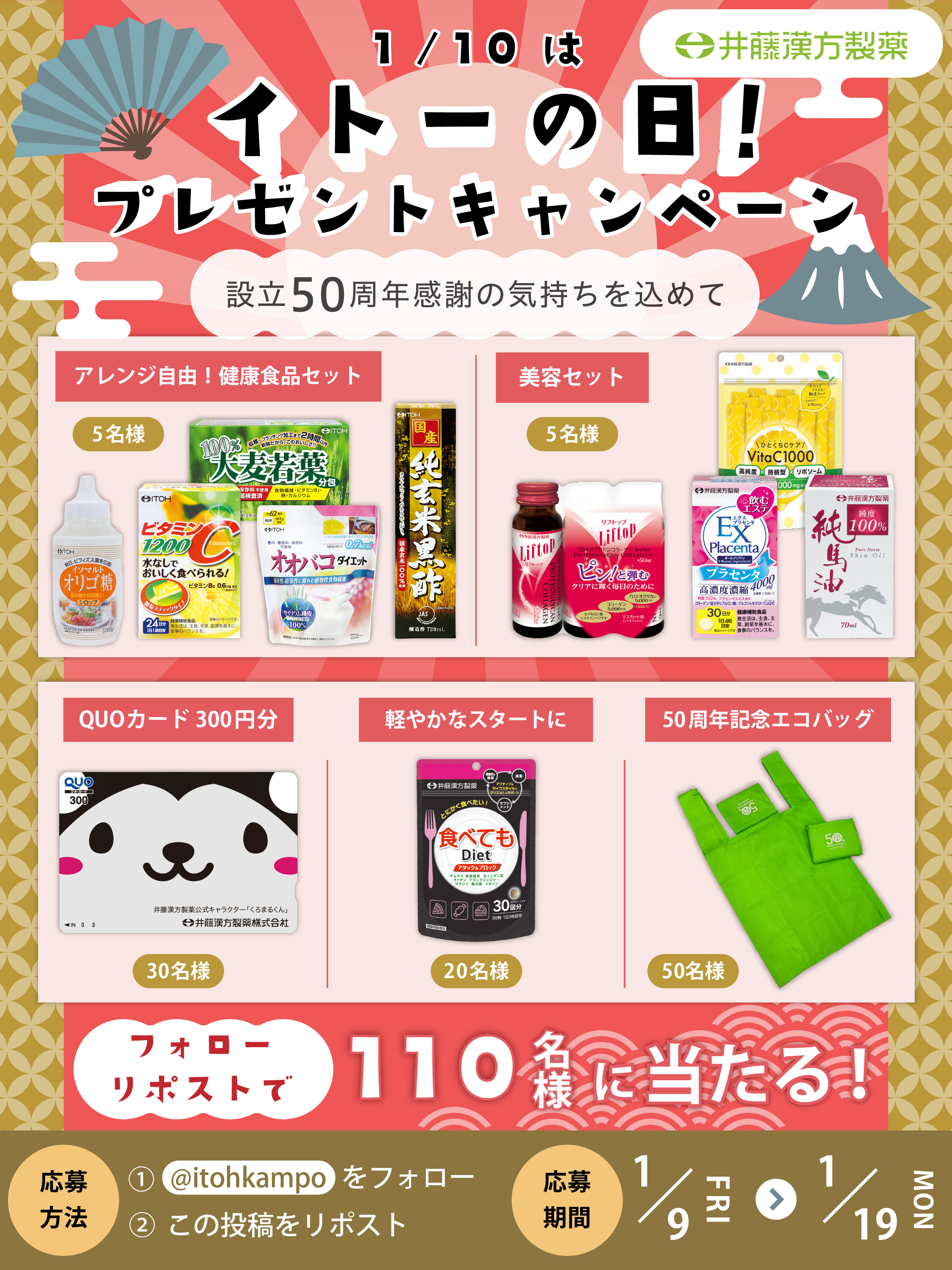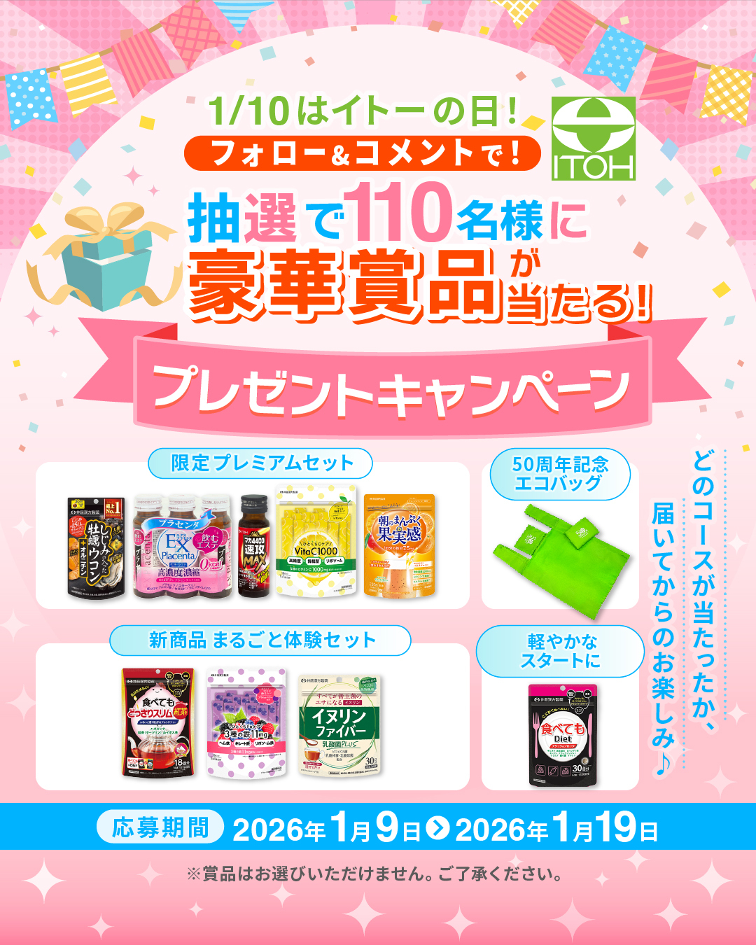 井藤漢方製薬株式会社は、2026年1月9日(金)より、公式Instagram(@itohkampo.official)およびX(@itohkampo)にて、抽選で総勢220名様に豪華賞品が当たるプレゼントキャンペーン「#イトーの日」を開催いたします。