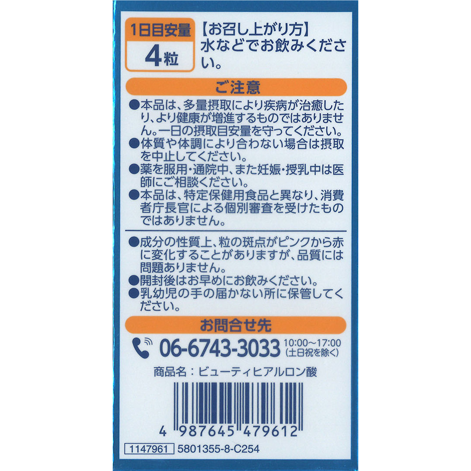 1日当たり:ヒアルロン酸 40mg、コラーゲンペプチド 300mg