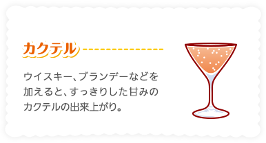 ![[カクテル]ウィスキー、ブランデーなどを加えると、すっきりした甘みのカクテルの出来上がり。](img/imgidea02.png)