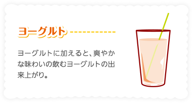 ![[ヨーグルト]ヨーグルトに加えると、爽やかな味わいの飲むヨーグルトの出来上がり。](img/imgidea04.png)
