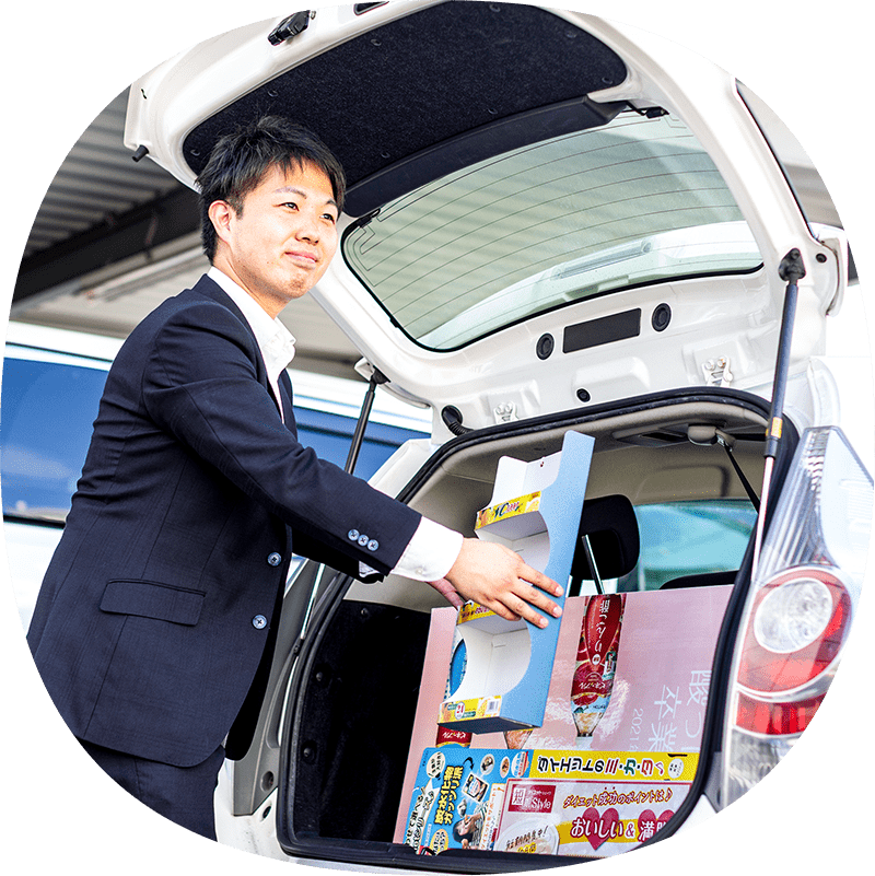 取引先店舗に足を運び、受注。販促POPを付けて売り場の作成も。