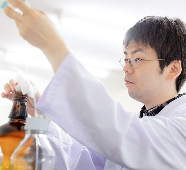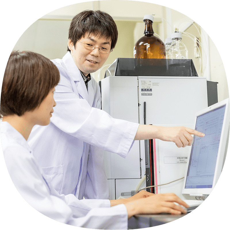 品質管理センターには、原料から製品までの各工程の検査を行う「試験検査チーム」、製造工程の管理や衛生管理を行う「品質推進チーム」の2チームがあります。私は試験検査チームに所属して検査業務を行っています。原料の受け入れ時には、原料の色や匂い等を確認します。中間製品であれば、微生物試験を行い、食中毒菌の有無や衛生状態を見極め、製品の安全性を確認しています。また、HPLC(高速液体クロマトグラフ)を用いて医薬品の有効成分やビタミン類が規定量含まれているか、GC/MS(ガスクロマトグラフ質量分析計)を用いて残留農薬が規定量以下であるかといった確認も行っています。最終製品の検査では、賞味期限が正しく印字されているか、内容量に問題ないか等の確認も行い、出荷の可否を判定しています。